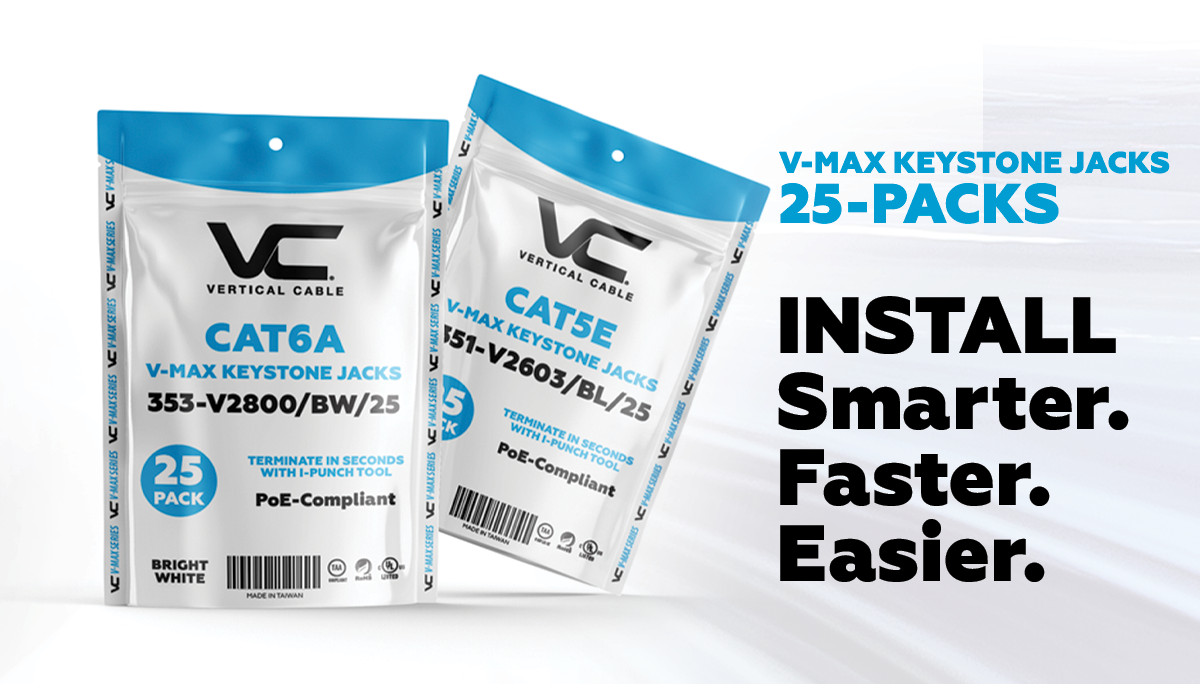 Contact your preferred distributor or visit VerticalCable.com to learn more about our V-Max Keystone Jacks in 25-packs and how they can make your next installation faster and more efficient.