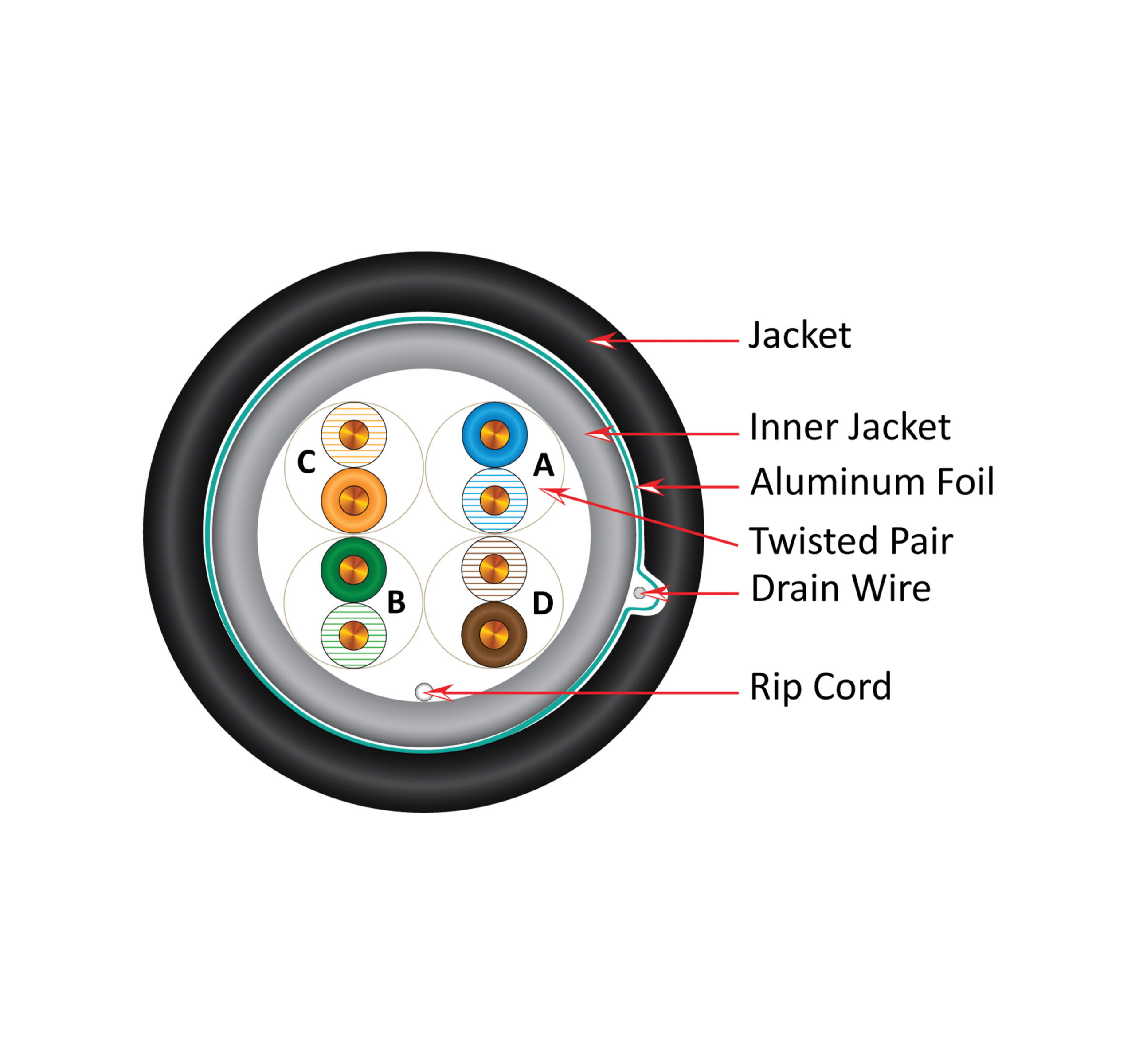 - F/UTP Foil Shielding: Overall aluminum foil shield with tinned copper drain wire provides superior EMI/RFI protection.