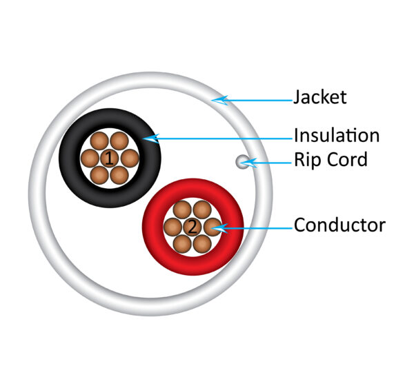 - PVC Insulation and Jacket: Durable white outer jacket and red/black insulation for identification and protection.