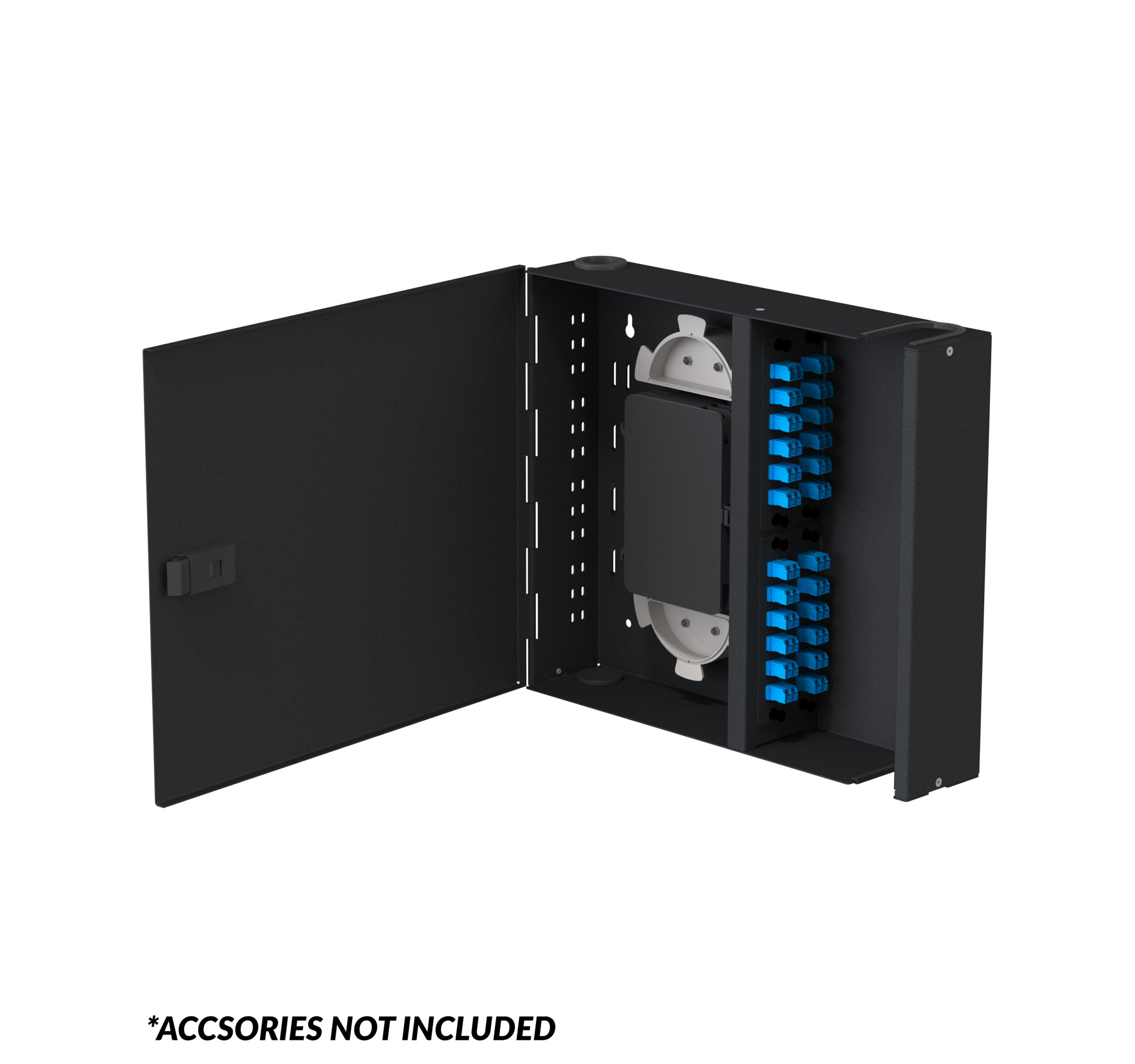 • Single-Door Access: Side-opening door with latch lock provides secure, convenient access to fiber connections.